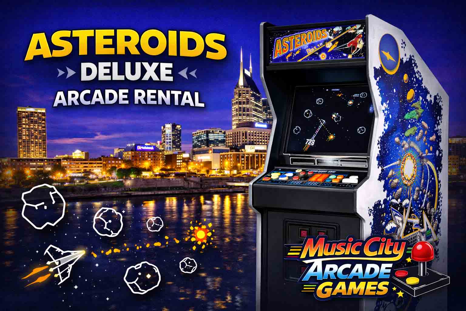 Asteroids Deluxe arcade game rental Nashville from Music City Mini Golf brings vintage space-shooter action to events, offering competitive scoring, authentic arcade gameplay, and retro entertainment perfect for corporate gatherings.