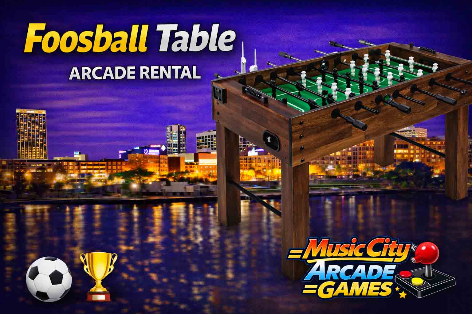 Foosball arcade game rental Nashville from Music City Mini Golf brings fast-paced tabletop competition to corporate events and parties, creating interactive head-to-head gameplay and energetic entertainment experiences guests love.