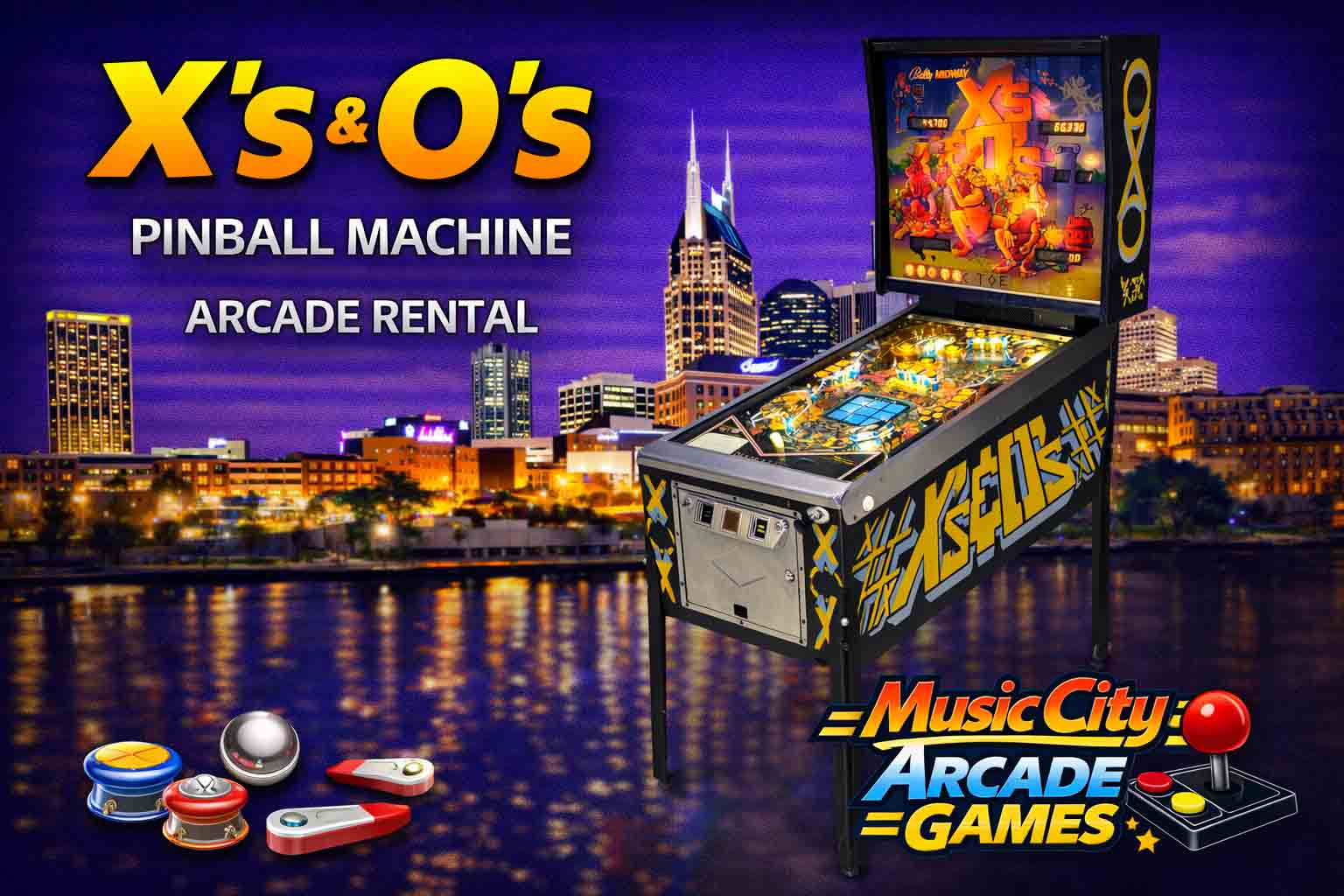 X’s and O’s pinball arcade game rental Nashville from Music City Mini Golf offers fast-paced flipper gameplay, bright visuals, and competitive fun ideal for corporate events, parties, and retro activations.