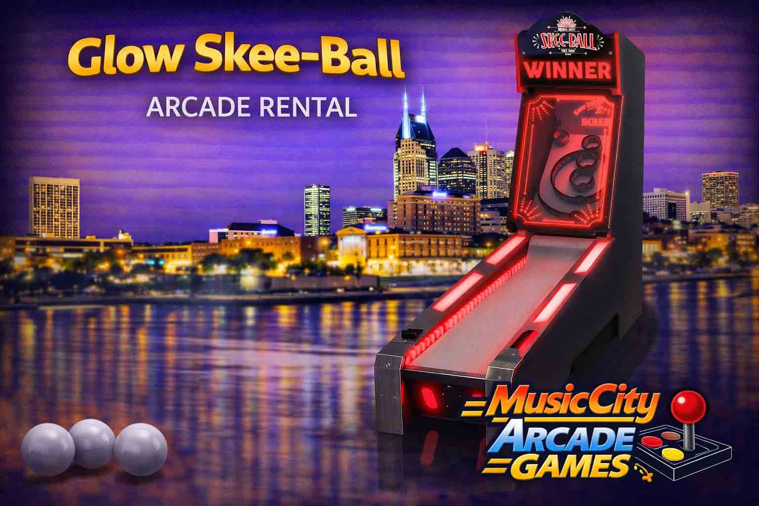 Glow Skee-Ball arcade game rental Nashville from Music City Mini Golf enhances events with LED-lit lanes, vibrant visuals, and interactive competition, delivering modern arcade excitement for nightlife events and parties.