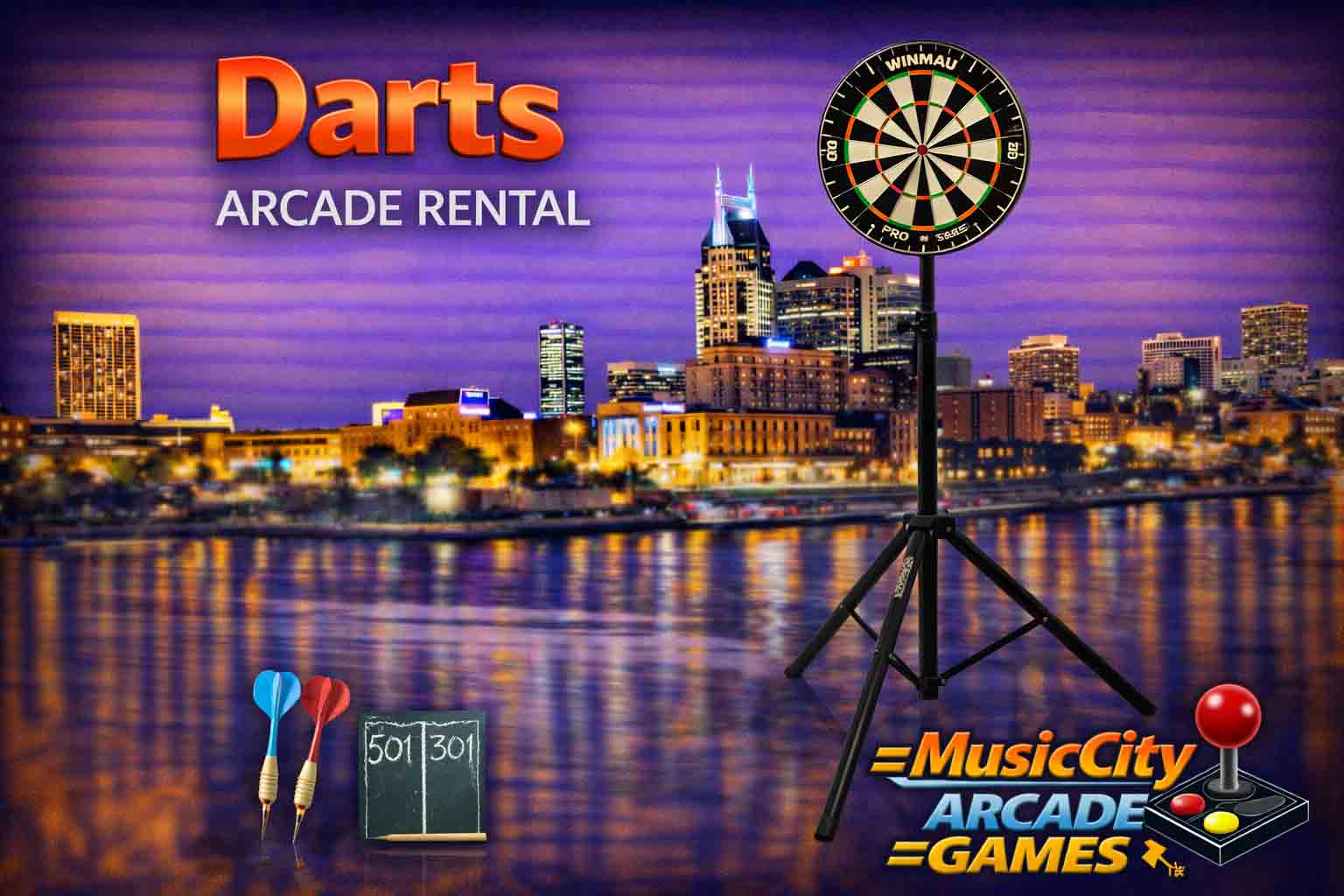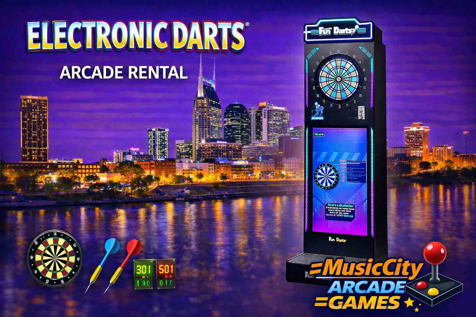 Electronic darts arcade game rental Nashville from Music City Mini Golf offers digital scoring, multiplayer competition, and interactive gameplay, creating modern entertainment experiences ideal for corporate events, parties, and branded activations.