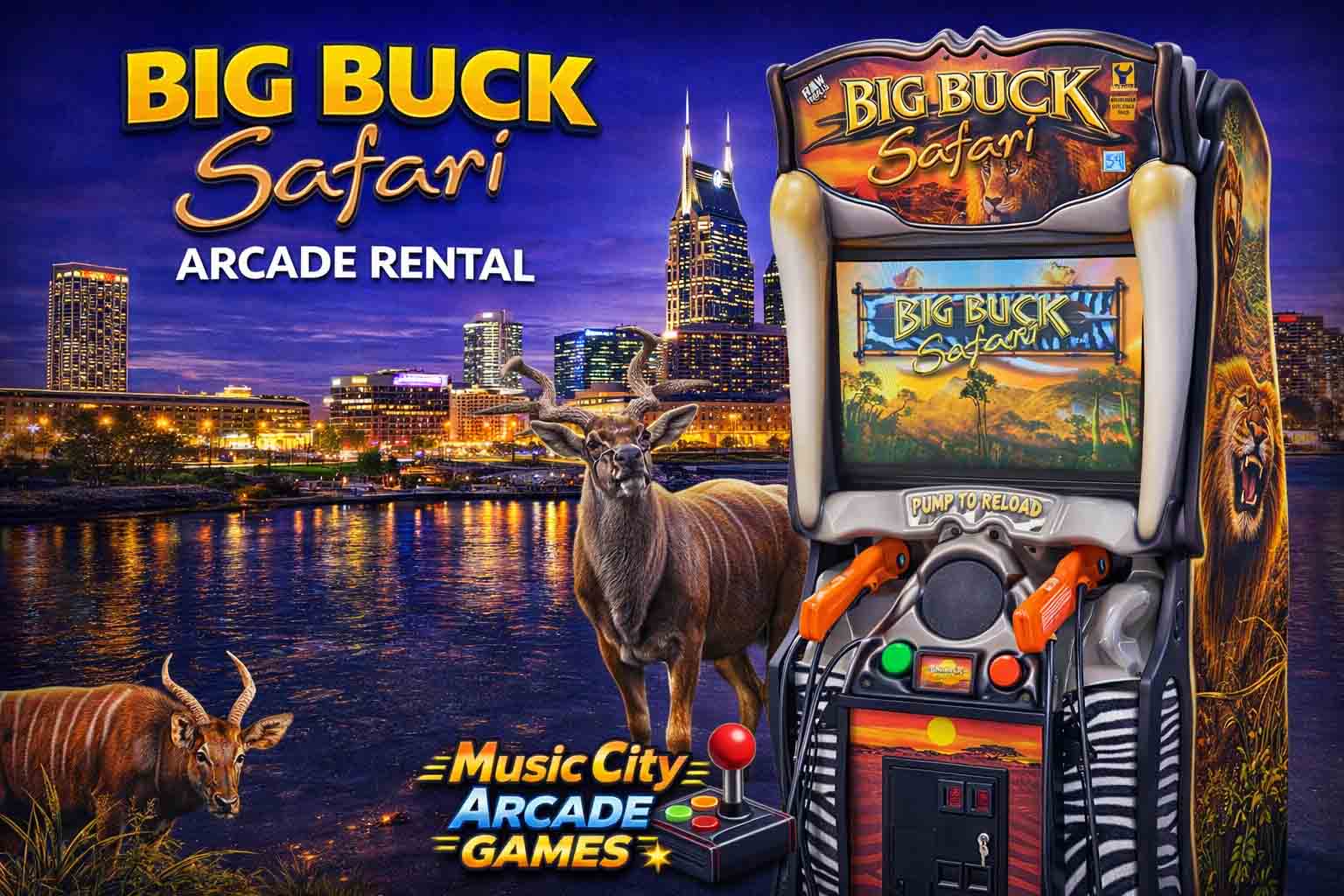 Big Buck Safari arcade game rental Nashville from Music City Mini Golf brings fast-paced safari shooting action, colorful environments, and competitive play perfect for corporate events and crowd engagement.