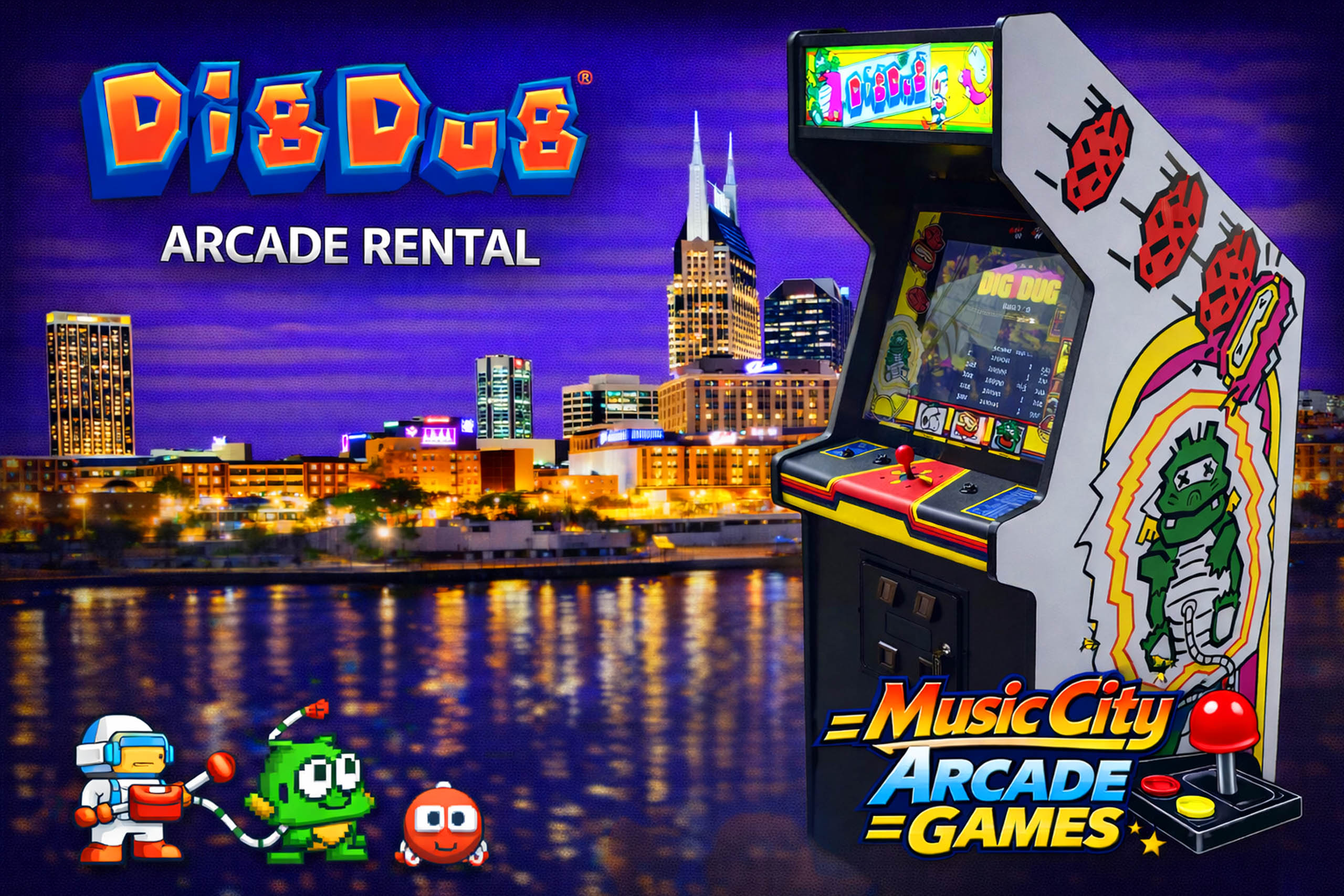 Dig Dug arcade game rental Nashville from Music City Mini Golf offers strategic underground gameplay, colorful retro visuals, and classic arcade excitement ideal for corporate events and nostalgic gaming experiences.