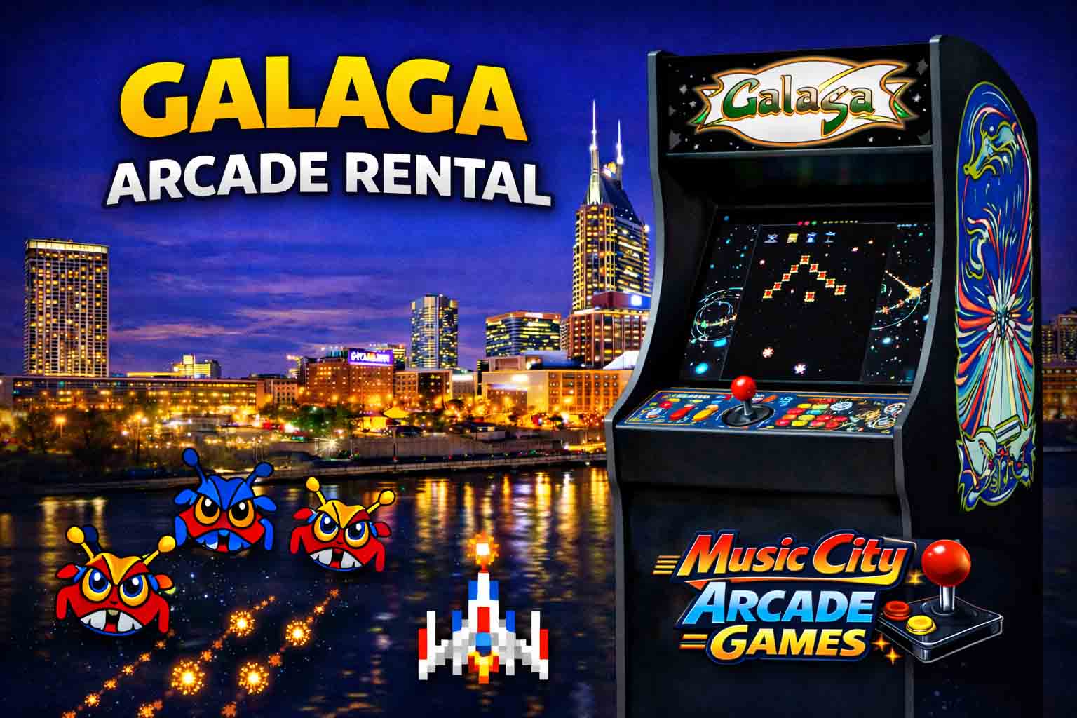 Galaga arcade game rental Nashville from Music City Mini Golf features legendary space-invader gameplay, competitive scoring, and nostalgic arcade entertainment perfect for corporate events, retro-themed parties, and festivals.
