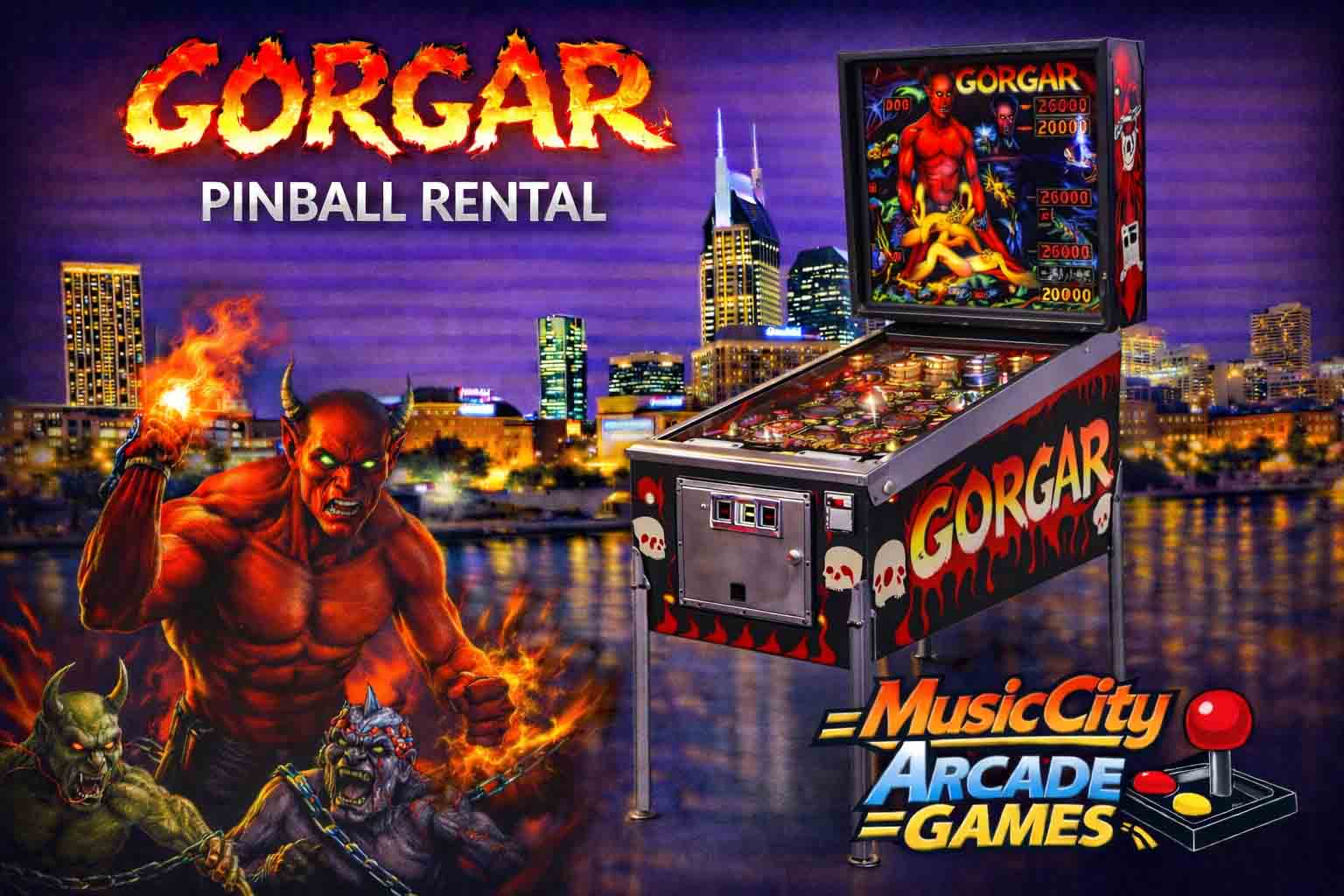 Gorgar pinball arcade game rental Nashville from Music City Mini Golf delivers intense classic pinball action, immersive sound effects, and competitive scoring perfect for corporate events and nostalgic arcade entertainment.