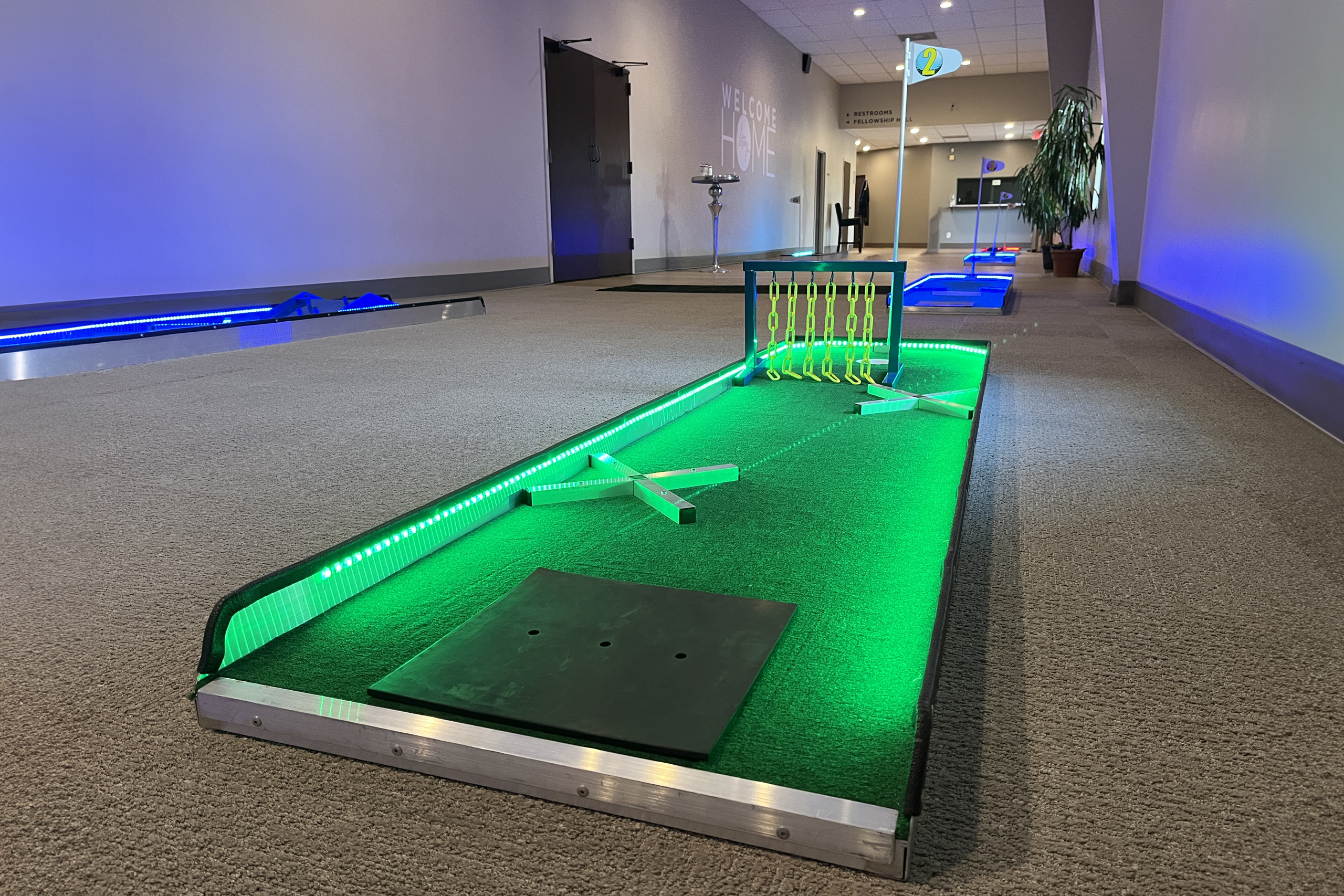 LED mini golf arcade game rental Nashville from Music City Mini Golf transforms venues with glowing courses, RGB lighting, and immersive visuals, delivering high-impact entertainment for nightlife events, corporate parties, and festivals.