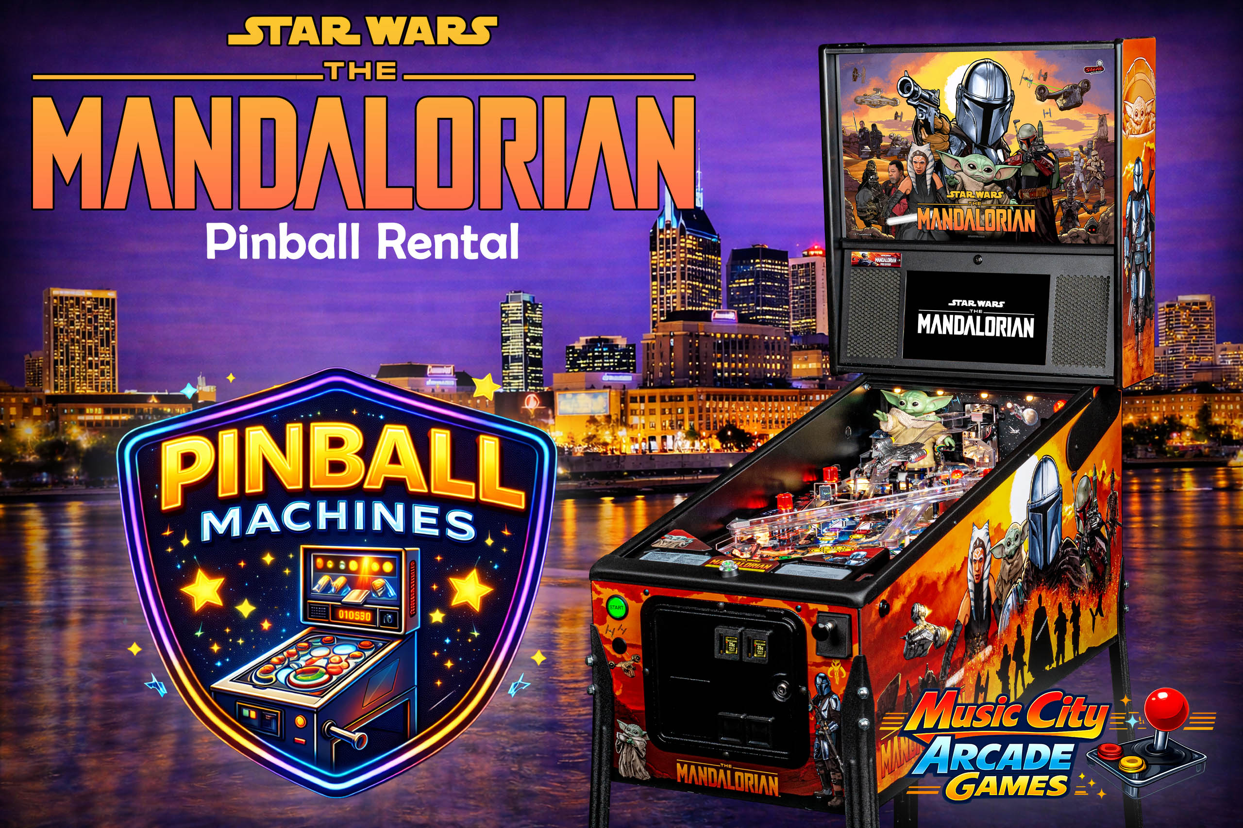 The Mandalorian pinball arcade game rental Nashville from Music City Mini Golf combines modern gameplay, dynamic visuals, and immersive features delivering premium interactive entertainment for corporate events and parties.