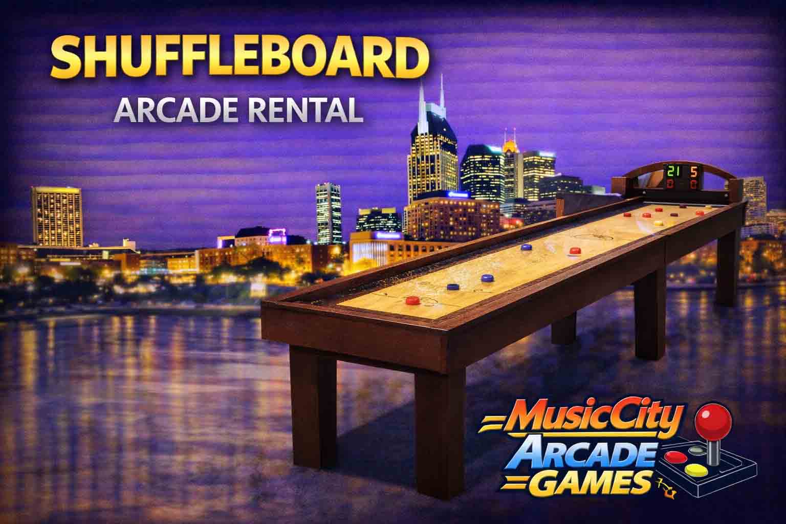Shuffleboard arcade game rental Nashville from Music City Mini Golf delivers stylish tabletop competition for corporate events and receptions, encouraging social interaction, relaxed gameplay, and upscale entertainment experiences guests enjoy.